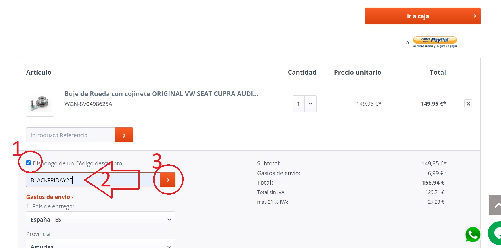 Primero indica que tienes un codigo descuento, a continuación introduce el código y por último clic en la flecha para activarlo.
